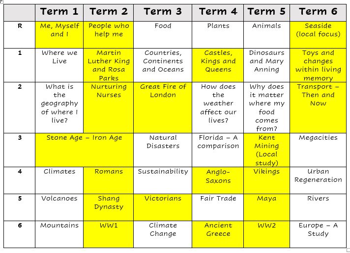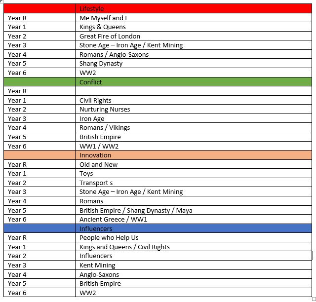 - Teach a logical, broad and balanced curriculum to include personal history, British history, ancient civilisations and topics covering continuity and change.